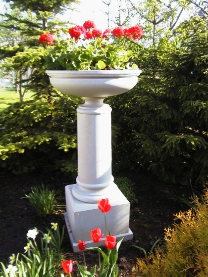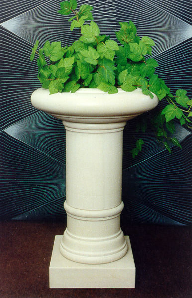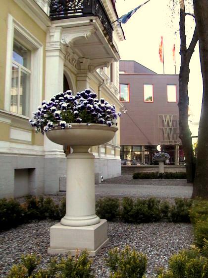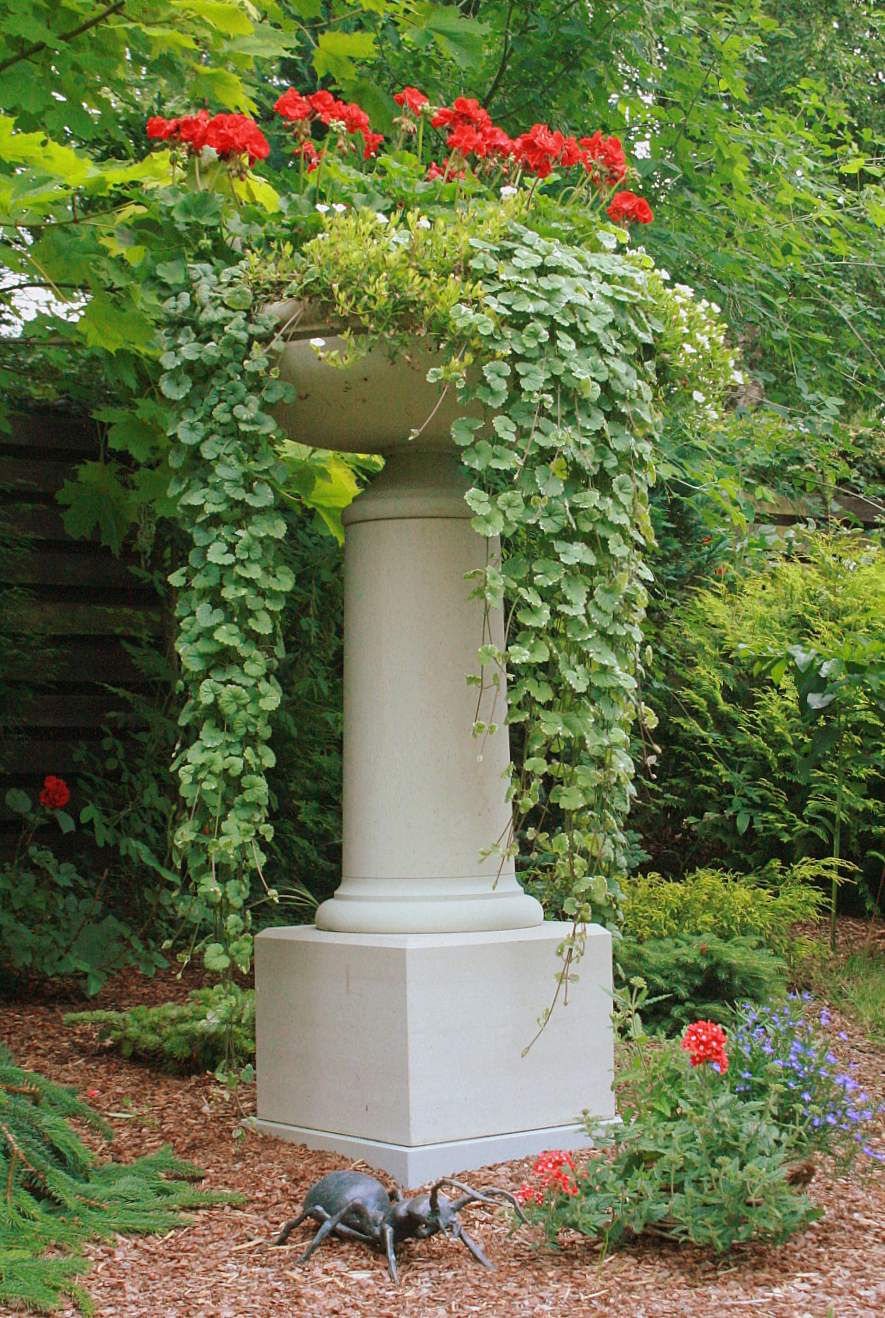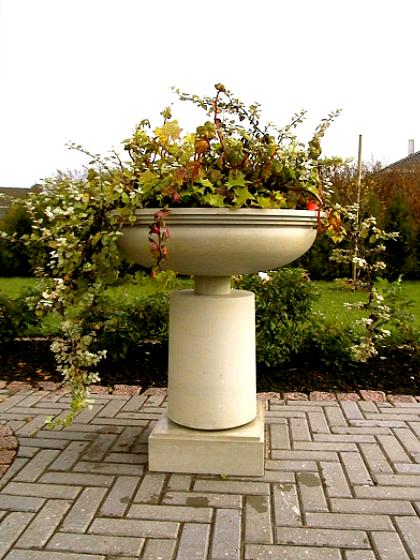 Цветочное блюдо из доломита в саду или парке создает привлекательную атмосферу; мы видим прекрасное произведение искусства, возникающее из сосуществования пышной растительности и каменной вазы. Зимой в каменном вазоне вырастает снежная шапка. Внутреннюю поверхность вазы из доломита покрываем двухкомпонентной каменной смолой для защиты от влаги, натираем внешние стороны воском. Так ваза служит десятилетиями. Отверстие в вазе для слива лишней воды. Мы также сделали копии исторических садовых ваз как по фотографиям, так и по сохранившимся деталям.